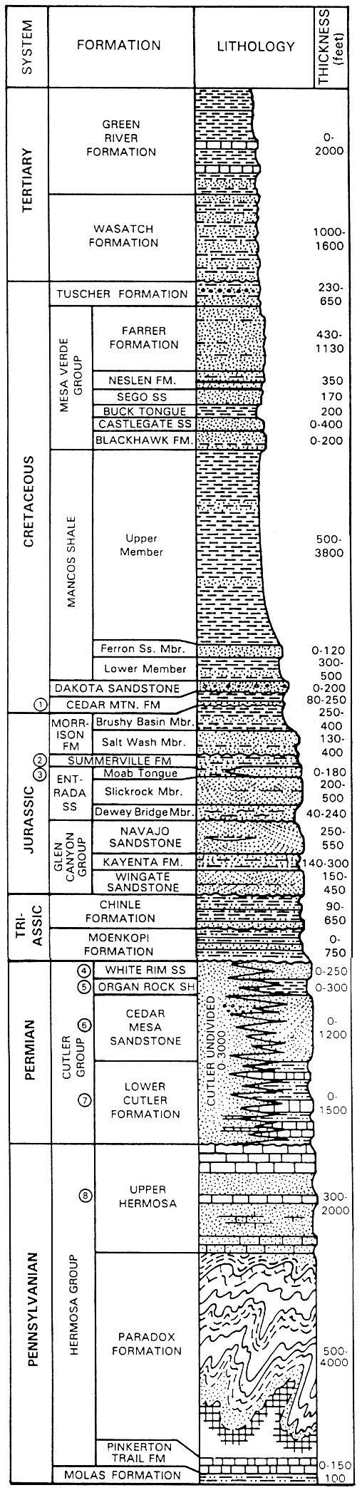 The following section describes the layers that are found in the Arches and Canyonlands region. They are quoted, with permission, from Signs of IMPACT! in Canyon Country, by F.A. Barnes, No. 57 of a series: pp. 26-31. The rock strata are listed in ascending order, starting with the oldest layer: the Paradox Formation.