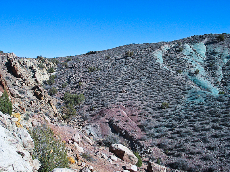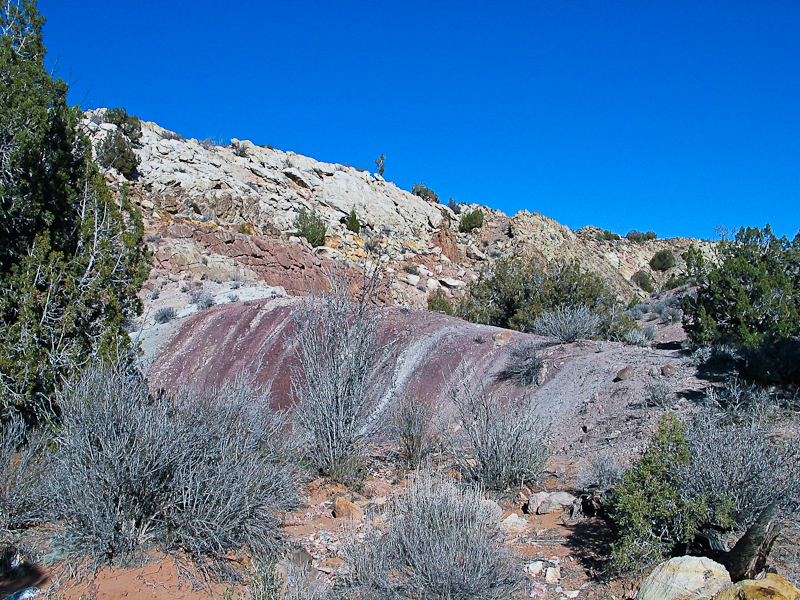 Changes in the general region brought finer sediments that were laced with ash from volcanoes farther west. Its broad, shallow streams and lakes deposited fine shales that are banded with various "painted desert" mineral hues. This environment was also favorable to prolific life. According to the conventional view, there was a very long interval of time between this deposit and the quite similar one that followed. The duration of this interval is highly questionable.