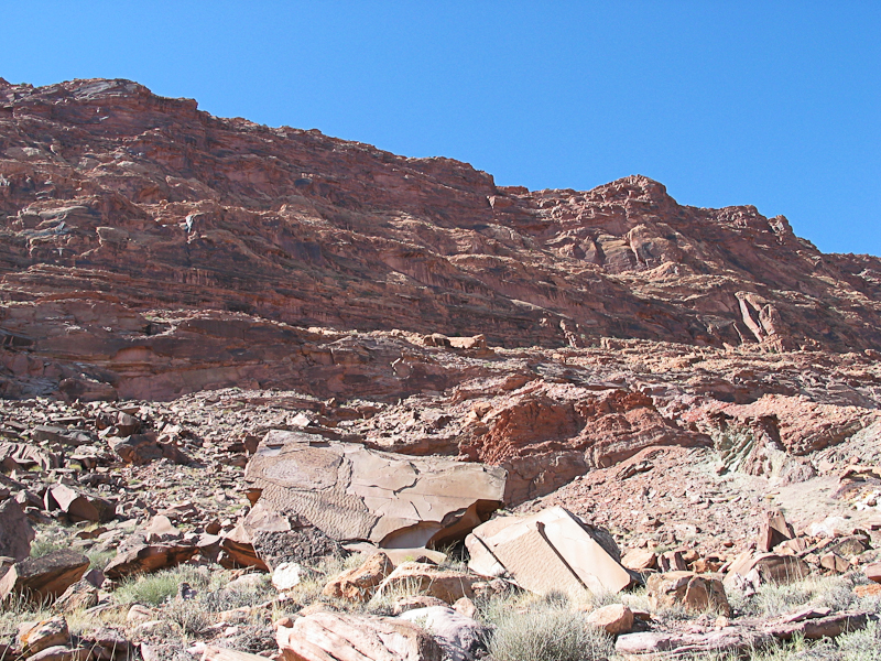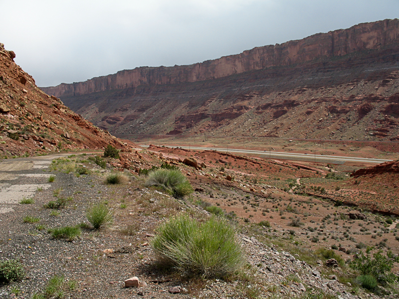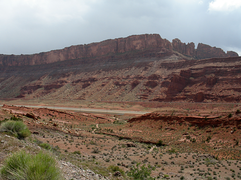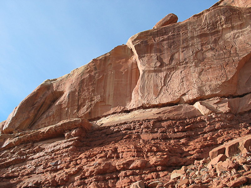 The Entrada members are overlain with this dark red, mineral-rich tidal-plain deposit. In parts of canyon country, similar-appearing deposits of the same age but of different origin are called the Tidwell Member of the Morrison Formation, however for practical purposes they are the same deposit. This is the last of the long series of deposits that hosted little if any life. After its deposition, large quantities of quarts, manganese oxides and other minerals formed within this red-mud deposit in some areas.