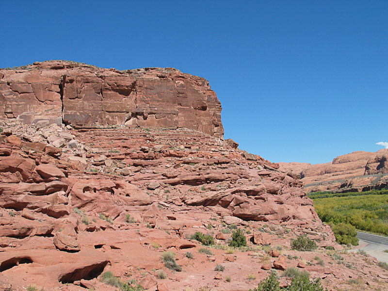 This cliff-forming sandstone is composed of coastal desert sands that for some unknown reason were frequently leveled and reworked by flooding. Wingate cliffs are generally red-hued but can vary in some regions. This is the first deposit made during a 40-million-year "Great Desert Period" in the canyon country region that was interrupted briefly only once by wetter times. The region was located in an equatorial position on Pangea during that extended period, resulting in a very hot, arid, windy climate broken only now and then by powerful equatorial storms. The Wingate environment was lifeless until very near its end, when a few small predator dinosaurs began to invade the region, although what they were seeking in such barren lands remains a mystery.