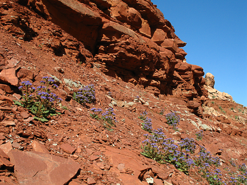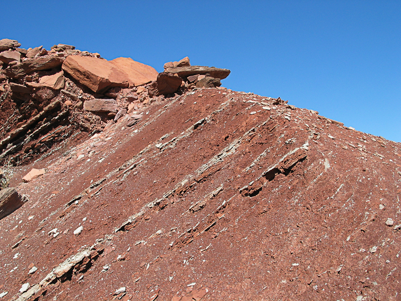 Again, the source of the deposit was the Uncompahgre, with the fine coastal-marine and tidal flat shales laid down in thin layers that are usually dark red from their high iron content.